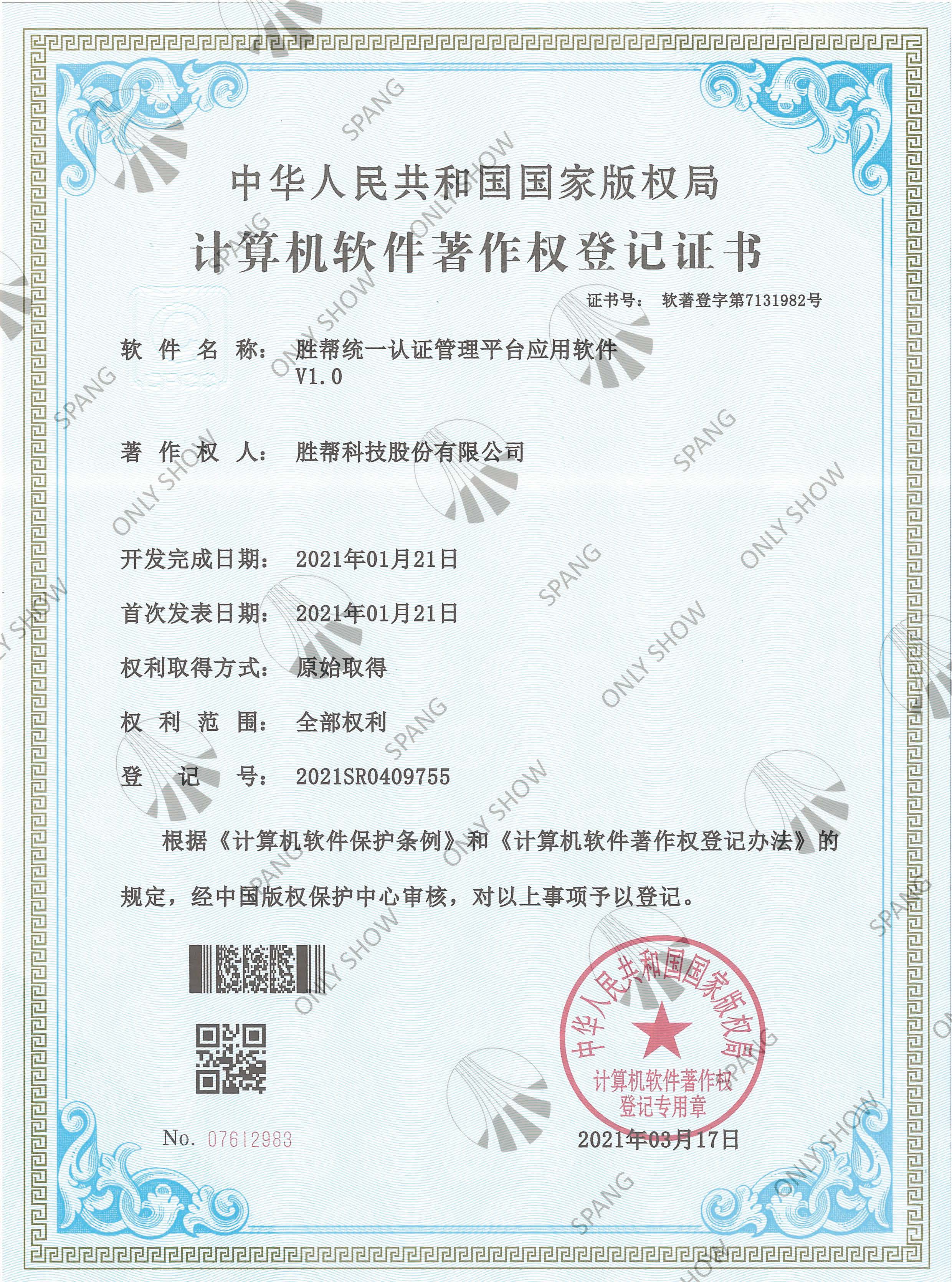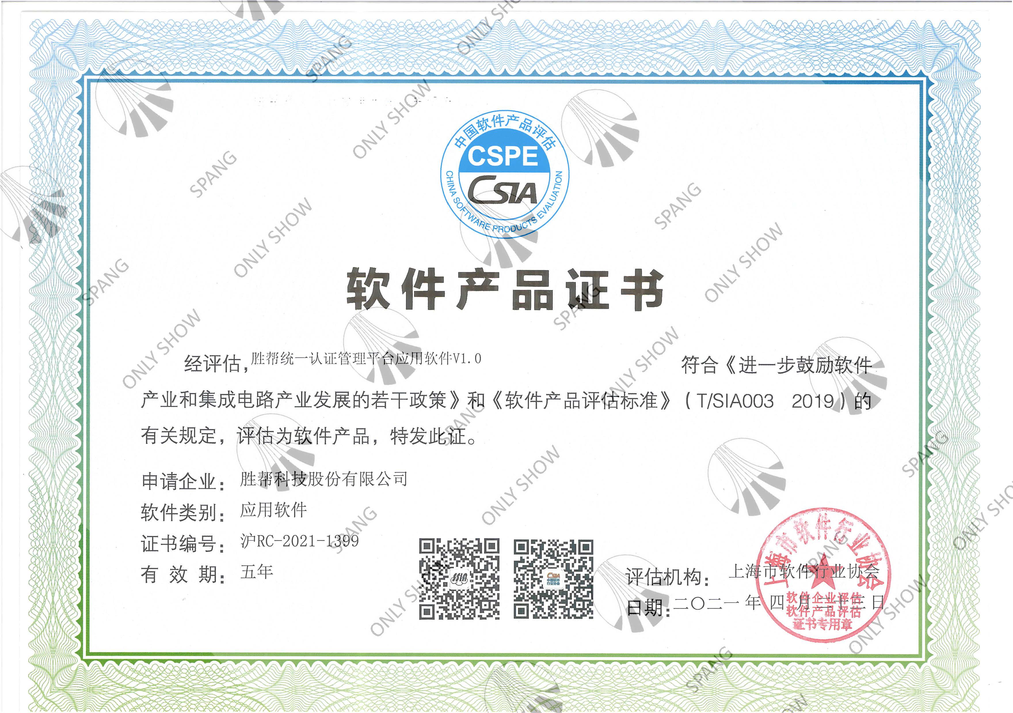 统一认证管理平台应用软件产品证书