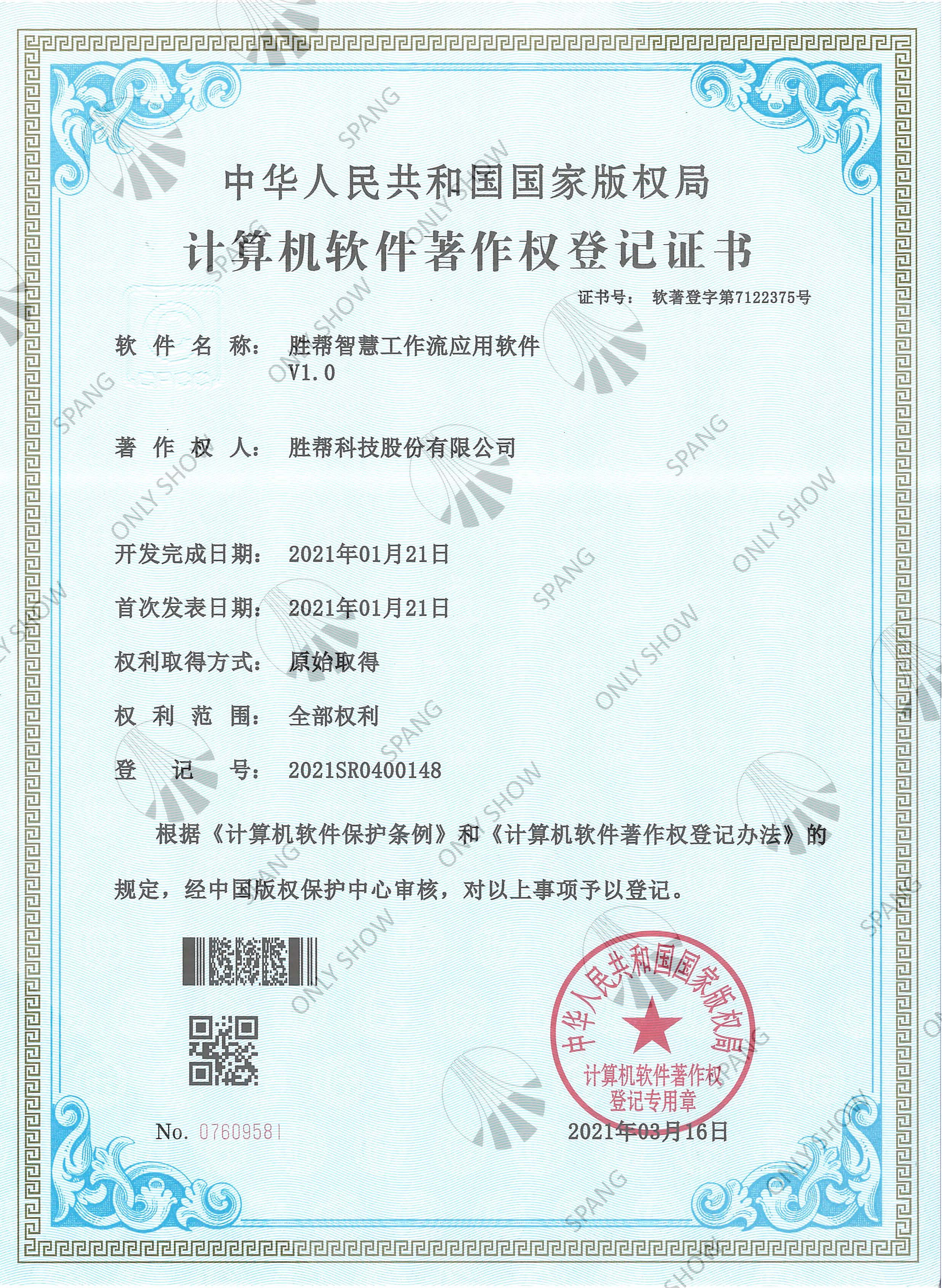 智慧工作流应用软件产品证书